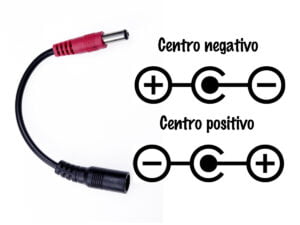 El centro de jack de alimentación puede tener polaridad negativa o positiva. La mayoría de los pedales y de las fuentes de alimentación tienen polaridad negativa, por lo que los puedes conectar directamente con el cable. Pero si tu efecto tiene polaridad positiva, y lo quieres conectar a una fuente de polaridad negativa, necesitarás usar un cable inversor de polaridad conectado al pedal antes del cable de alimentación.