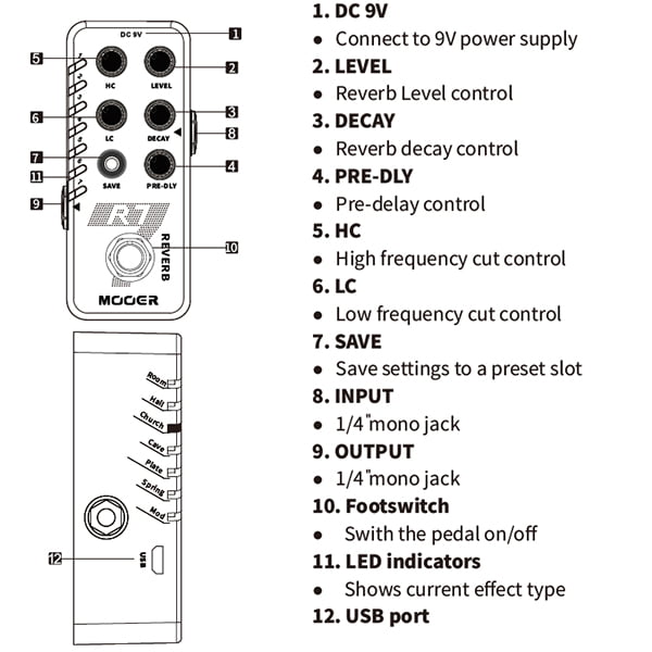 Con el mismo diseño pequeño e intuitivo, este pedal ofrece 7 algoritmos de reverb (Room, Hall, Church, Cave, Plate, Spring y Mod), que podemos modificar a nuestro gusto mediante los controles de Level, Decay, y Pre-Delay. También posee dos filtros de ecualización Hi-Cut y Low-Cut.