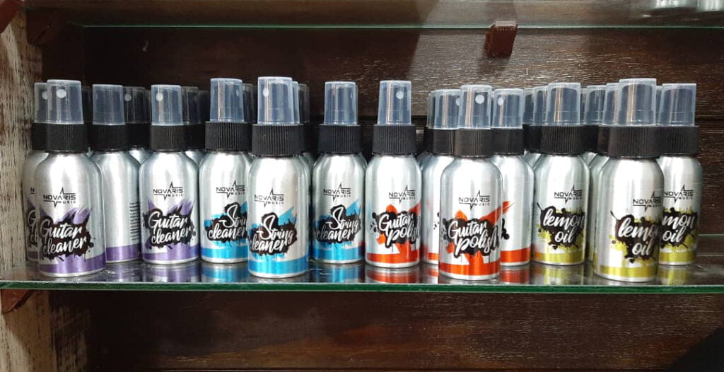 Tenemos disponibles los productos Novaris para mantención de instrumentos de cuerda como guitarras y bajos. Estos productos están fabricados en Chile a base a aceites biodegradables que no dañan el medioambiente.